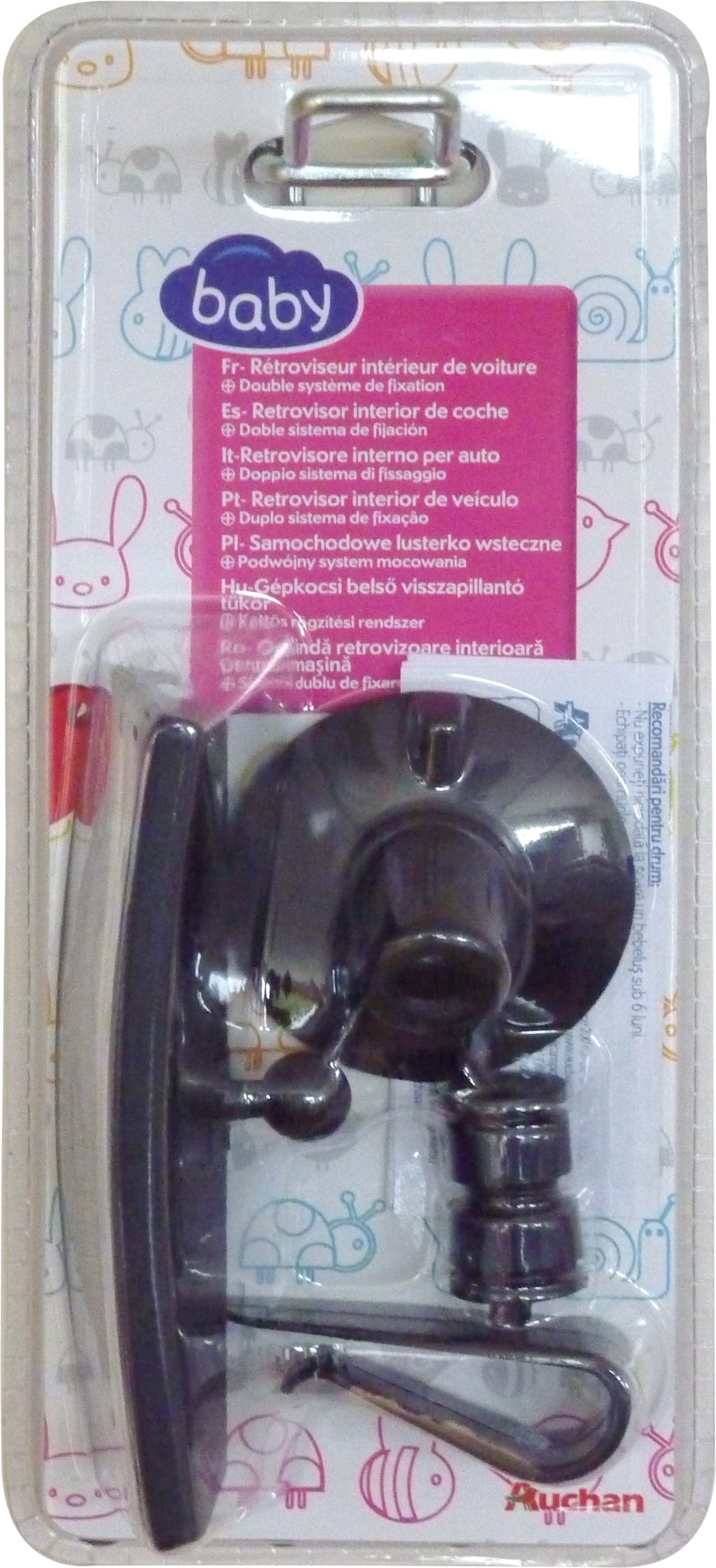 Rétroviseur de voiture avec double système de fixation. Vous pouvez soit le fixer par la lunette arrière à l’aide de la ventouse ou par le pare soleil grâce à la pince.