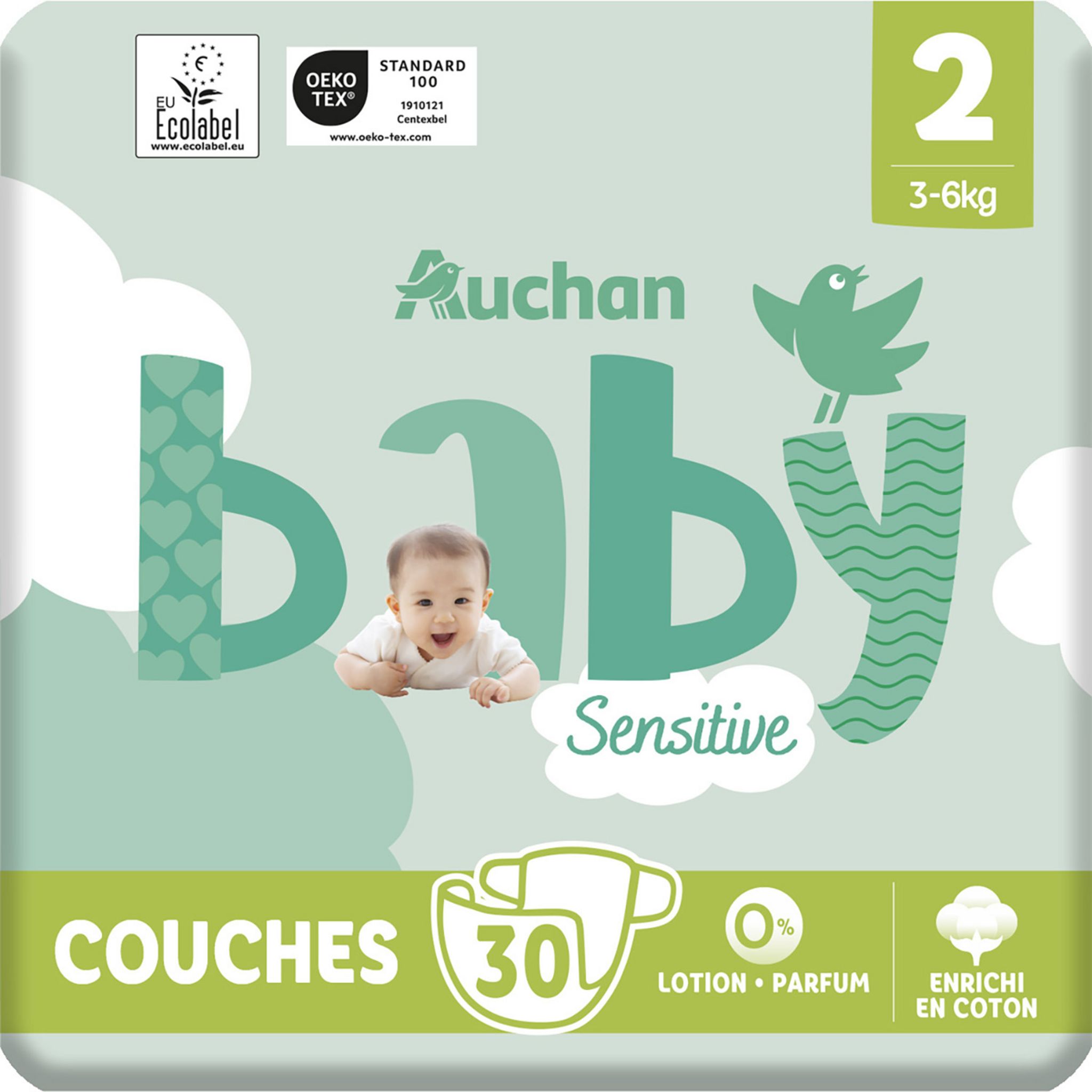 Parce que le bien-être de votre bébé est notre priorité, les couches Auchan Sensitive allient protection, efficacité et sécurité. Elles sont composées de fibres de cellulose certifiées FSC® blanchies sans chlore, et de canaux d'absorption pour une peau bien au sec et une absorption maximale. Le voile en contact avec la peau est d’origine naturelle et enveloppe Bébé dans un nid de douceur. Canaux d'absorptionBarrières anti-fuitesDécoupe ombilicaleIndicateur d'humiditéUltra douxVoile extérieur enrichi en coton imperméable et respirantToucher ultra secVoile en contact avec la peau d'origine naturelle testé dermatologiquementEmballage en papier 100% recyclable0% parfum, lotion, colorant en contact avec la peau