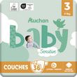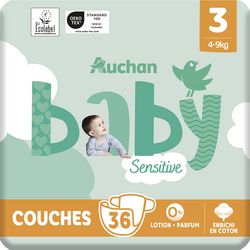 Parce que le bien-être de votre bébé est notre priorité, les couches Auchan Sensitive allient protection, efficacité et sécurité. Elles sont composées de fibres de cellulose certifiées FSC® blanchies sans chlore, et de canaux d'absorption pour une peau bien au sec et une absorption maximale. Le voile en contact avec la peau est d’origine naturelle et enveloppe Bébé dans un nid de douceur.Canaux d'absorptionBarrières anti-fuitesCellulose non blanchie au chlore (TCF)Ultra douxVoile extérieur enrichi en coton imperméable et respirantToucher ultra secAttaches repositionnablesVoile en contact avec la peau d'origine naturelle testé dermatologiquement.Emballage en papier 100% recyclableJusqu'à 12h de protection 0% parfum, lotion, colorant en contact avec la peau