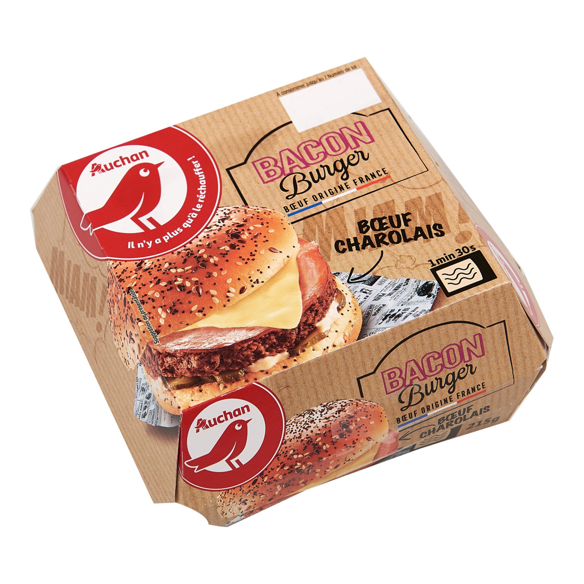 Garniture58,7%: steak haché de viande bovine de race charolaise cuit* (origine France) 32,6%, sauce saveur bacon 11,2% (huile de colza, eau,amidons modifiés de pomme de terre, moutarde de Dijon (eau, graines de moutarde, vinaigre d'alcool, sel), vinaigre d'alcool, sucre, oignon, jaune d'œuf, arôme, arôme naturel, sel, caramel (sucre, eau), arôme de fumée, huile de tournesol), emmental (lait origine UE) 7%,bacon cuit choix fumé 5,6% (jambon de porc (origine France) 4,9%,eau, sel, sirop de glucose, arômes naturels, stabilisant :triphosphates, antioxydant : érythorbate de sodium, conservateur :nitrite de sodium), cornichons au vinaigre 2,3% (cornichons, eau, vinaigre d'alcool,sel, affermissant : chlorure de calcium, conservateur :disulfite de potassium).Pain spécial* 41,3% : farine de blé, eau, sucre, poudreau beurre (lait origine UE/non UE) (beurre (lait),protéines de lait, perméat de lactosérum (lait)), lait écrémé en poudre (origine UE), levure, huile de colza, mélange de graines (lin brun, graines de sésame, pavot), gluten de blé,sel, poudre d'acérola, protéines de pois, farine de riz, siropde glucose.Traces éventuelles de autres céréales contenant du gluten, céleri et poissons. Pourcentagesexprimés sur le total de la recette.*Mise en œuvre d'ingrédients décongelés, ne pas recongeler.