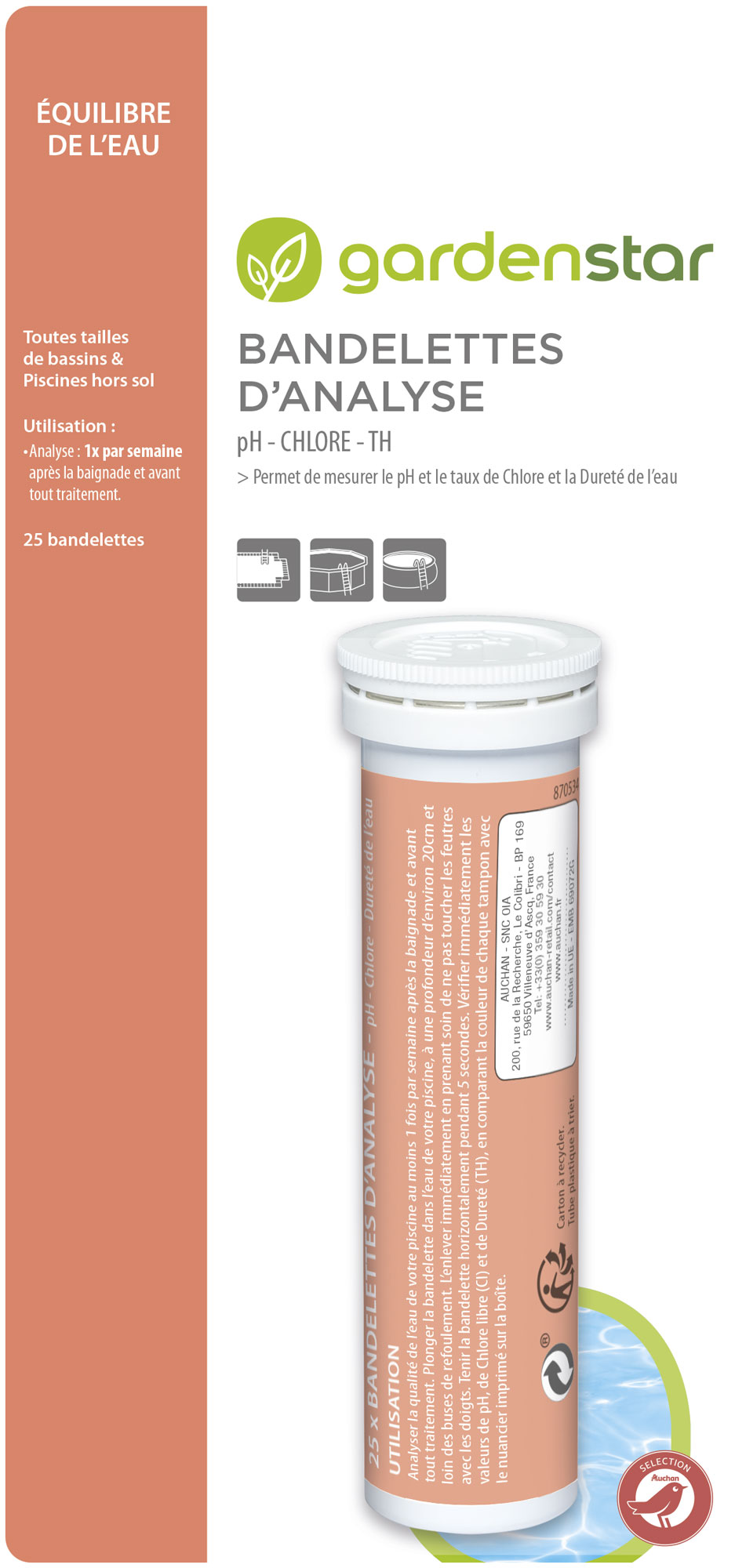 Analyser la qualité de l’eau de votre piscine au moins 1 fois parsemaine après la baignade et avant tout traitement. Plonger la bandelette dans l’eau de votre piscine, à une profondeur d’environ 20cm et loin des buses de refoulement. L’enlever immédiatement en prenant soin de ne pas toucher les feutres avec les doigts. Tenir la bandelette horizontalement pendant 5 secondes. Vérifier immédiatement les valeurs de pH, de Chlore libre (Cl) et de Dureté (TH), en comparant la couleur de chaque tampon avec le nuancier imprimé sur la boîte.