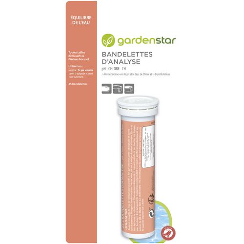 Ce kit d'analyse contient 25 bandelettes qui permettent de mesurer le pH, le taux de chlore et la dureté de l'eau. Les analyses se font parès la baignade et avant tout traitement.