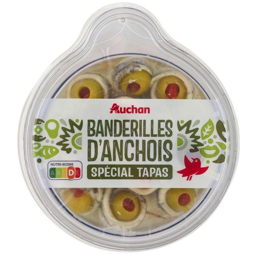 Ingrédients : Olives farcies au poivron rouge 40-37% [poivron rouge,épaississant : alginate de sodium, gomme de guar, conservateur :sorbate de potassium, saumure (eau, sel, acidifiant : acide citrique , chlorure de calcium)], filets d'anchois marinés(Engraulis encrasicolus) (poisson) 35-38% (filet anchois, vinaigre d'alcool,sel, acidifiant : acide citrique), huile de tournesol 25 %