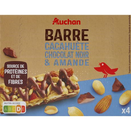 Cette barre cacahuètes contient 75% de cacahuètes, d'amandes et de chocolat (Nutriscore D). Ces barres sont sources de fibres et proposées en étui de 4.