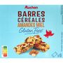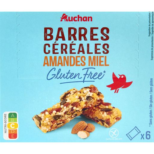 Ingrédients : Sirop de glucose-fructose, AMANDES 13,5%, flocons d'AVOINE 12,5% (sans gluten), raisins secs 11% (raisins, huile de coton), graines de courge, pétales de maïs 9,5% (maïs, sel), riz soufflé 5%, huile de tournesol, miel 2.5%, sirop de glucose en poudre, émulsifiant: lécithines de tournesol, antioxydant: extrait riche en tocophérols. Traces éventuelles de lait, d'arachides et d'autres fruits à coque