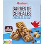 Ingrédients : Sirop de glucose, flocons d'AVOINE 19%, céréales croustillantes (farine de BLÉ 8,5%, farine de riz 3,5%, dextrose, sucre, sel), pépites de chocolat au LAIT 8% (sucre, LAIT entier en poudre, beurre de cacao, pâte de cacao, lactose (LAIT), émulsifiant: lecithines (SOJA), arôme), pétales de maïs (maïs 6%, sel, extrait de malt d'ORGE), pétales de BLÉ complet (BLÉ complet 5,5%, extrait de malt d'ORGE, sel), huile de tournesol, CACAHUÈTE 3%, stabilisant: sorbitols, miel, cacao maigre en poudre, émulsifiant: lécithines (SOJA), arôme naturel de NOISETTE, antioxydant: extrait riche en tocophérols. Traces éventuelles d'autres fruits à coque et d'autres céréales contenant du gluten.