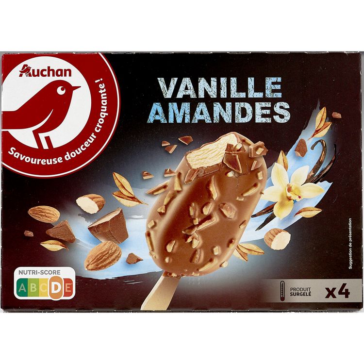 Bâtonnets de glace à la vanille 68,2%, enrobage chocolat au lait 26,7%, morceaux d'amandes grillées 5,1%, surgelés