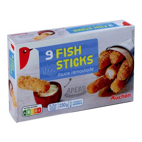 Bâtonnets : Filet de Colin d'Alaska (poisson) (Gadus chalcogramma) 54%, farine de blé enrichie (carbonate de calcium, fer, niacine (vitamine B3), thiamine (vitamine B1)), huiles végétales (tournesol, colza), eau, amidon de blé, amidon de pois modifié , sel, farine de maïs, dextrose, dextrine de pois, gluten de blé.. Traces eventuelles de moutarde, lait et de sésame.. Sauce Remoulade: . Eau, crème (lait origine UE), moutarde (eau, farine de moutarde, vinaigre d'alcool, sel, épices, extraits d'épices), concombres en cubes (concombres, vinaigre d'alcool, sel), oignons, amidon de maïs modifié , sucre, sel, vinaigre d'alcool, herbes aromatiques et épices, jus de citron concentré, protéines hydrolysées de maïs et de colza, épaississants: gomme xanthane, gomme de guar. . . % exprimés sur le total de chaque recette..