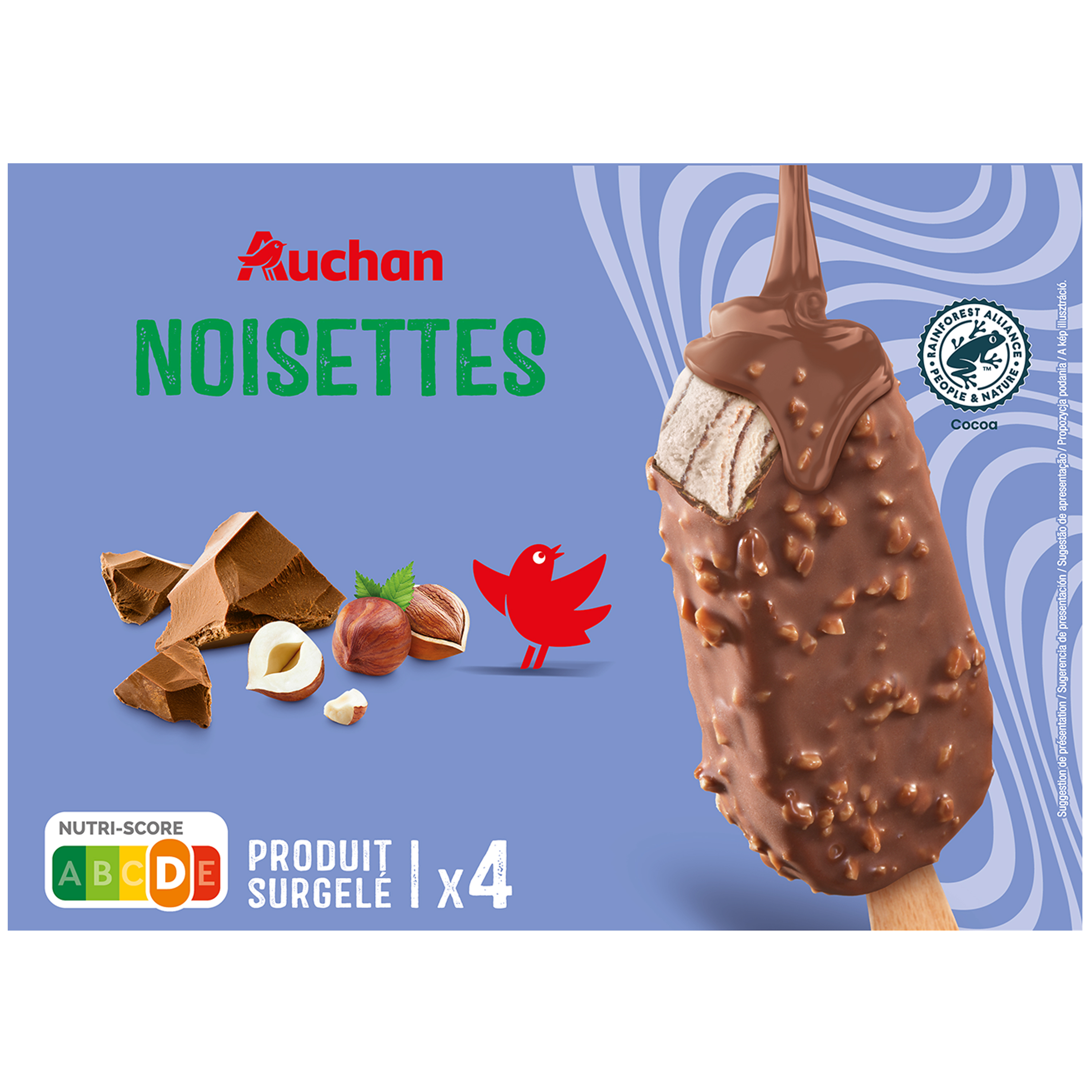 Ingrédients : sucre, LAIT écrémé, crème fraîche (LAIT), beurre de cacao*, sirop de glucose, concentré de protéines de lactosérum (LAIT), NOISETTES 5,8%, eau, grasses végétales (colza, coco), lactosérum en poudre (LAIT), matière grasse laitière anhydre (LAIT), pâte de cacao*, LAIT écrémé en poudre, pâte de NOISETTES 1,7%, concentrés ( pomme, carotte, hibiscus, mélasse), cacao maigre en poudre* émulsifiants : lécithines, polyricinoléate de polyglycérol, mono- et diglycérides d’acides gras stabilisant : alginate de sodium, arôme naturel (contient FRUITS À COQUE), extrait de vanille. Elaboré à partir de lait origine UE. *Certifié Rainforest Alliance. Pour en savoir plus, rendez-vous sur ra.org. Traces éventuelles d'autres fruits à coque