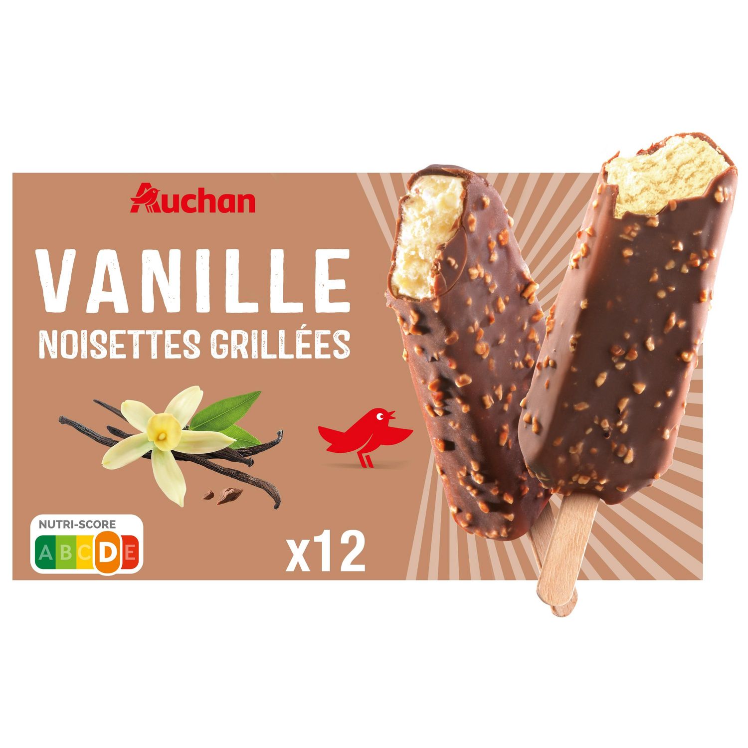 12 bâtonnets de glace à la vanille (70,3%) enrobés de pâte à glacer au cacao maigre (26,6%) avec des noisettes hachées grillées (3,1%).