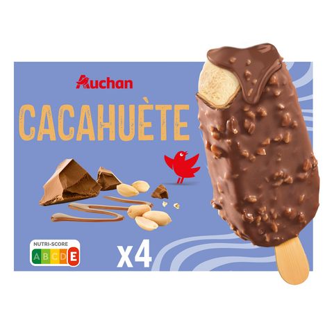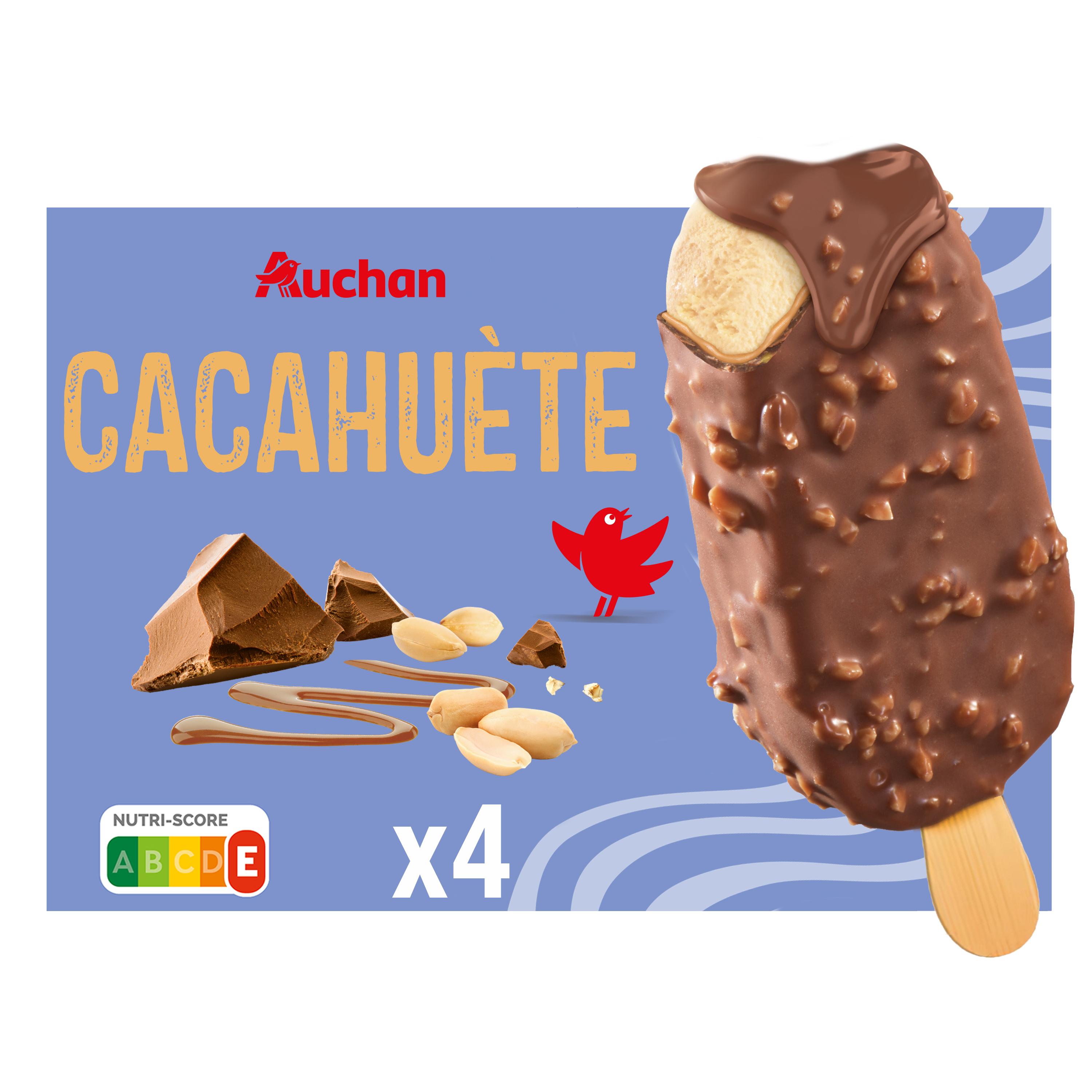 Bâtonnets de crème glacée à la cacahuète 43.7%, avec un enrobage de sauce à la cacahuète 19.7%, enrobage au chocolat au lait 32.4% avec des morceaux de cacahuètes grillées 4.2%