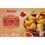 Queues de crevettes enrobées d'une pâte à beignet accompagnées d'une sauce aigre-douce, surgelées.