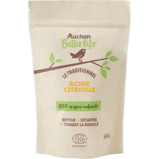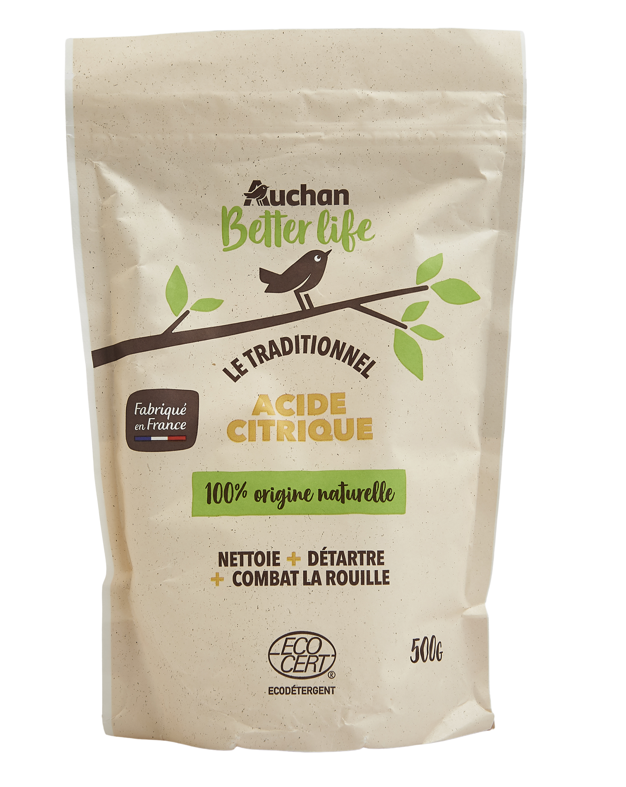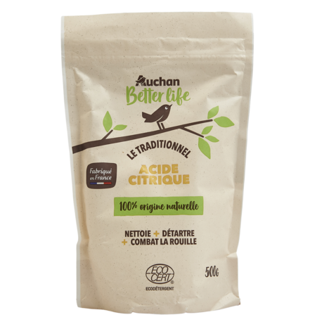 Pour réduire l’impact environnemental, respecter les doses recommandées d’utilisation.> Détartrer les surfaces (cuisine et salle de bain) : versez 3 cuillères à soupe d’acide citrique dans un demi litre d’eau. Utilisez le mélange sur les surfaces à nettoyer (chrome, inox, céramique, plastique), laissez agir puis rincez.> Détacher les fonds de casseroles brûlées et taches de thé ou café : versez 1 à 2 cuillères à soupe dans le récipient, versez de l’eau bouillante, laissez agir quelques minutes puis rincez soigneusement.> Détartrer les appareils électroménagers (cafetières, bouilloires) : mélangez 1 à 2 cuillères à soupe dans 1 litre d'eau. Mettre en marche l'appareil, laissez agir et rincez soigneusement à l'eau claire. (machines à laver, lave-vaisselle) : versez 6 à 8 cuillères à soupe dans l’appareil et faites tourner un cycle à vide.> Eliminer la rouille : mettre une cuillère à café d'acide citrique sur une éponge. Frottez la zone rouillée, laissez agir puis rincez.