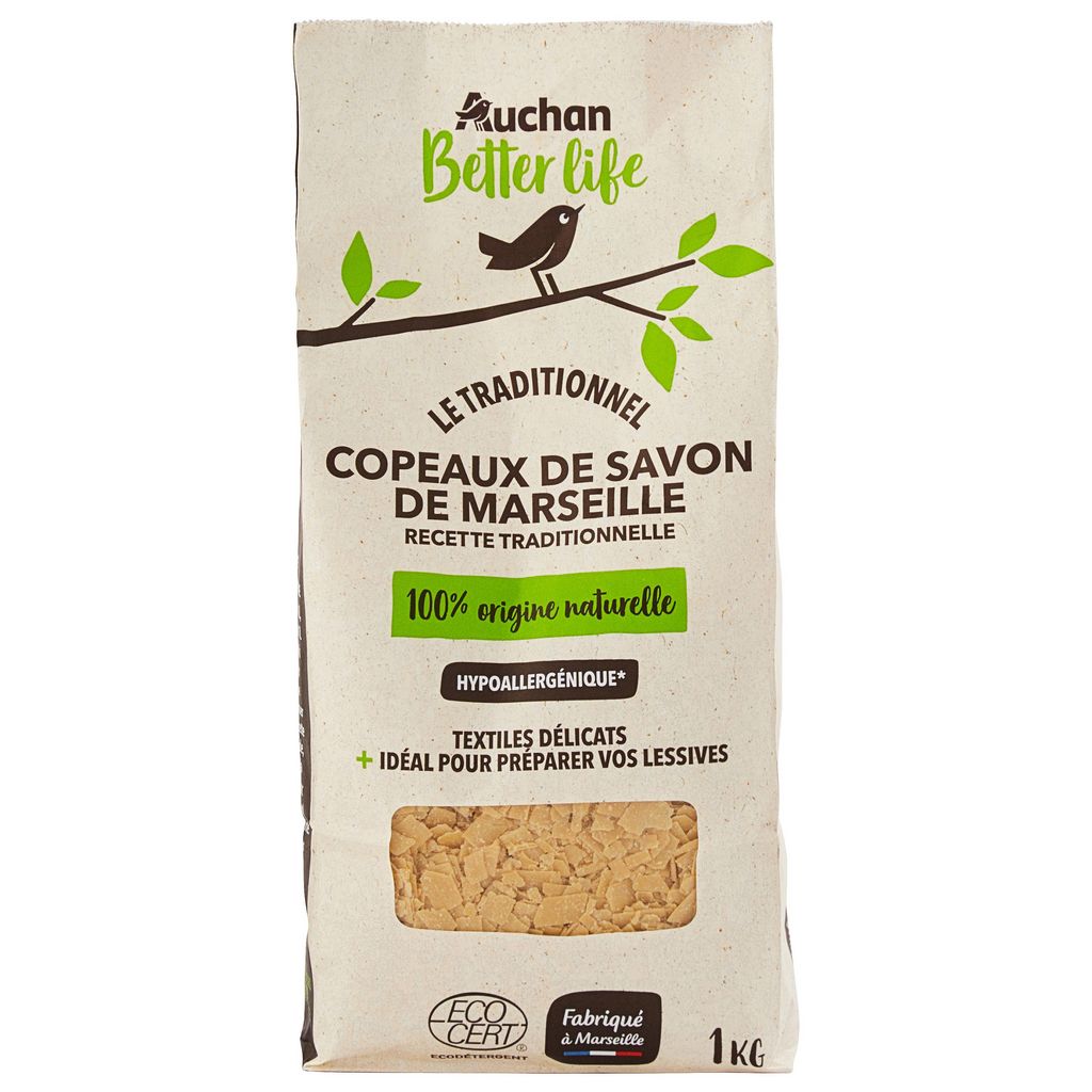 Idéal pour préparer vos lessives et convient aux textiles délicats.Les copeaux de savon de Marseille, cuit au chaudron à Marseille, sont élaborés dans le respect des traditions à base d'huiles exclusivement d'origine végétale.Sans colorant, ni parfum, leur couleur et odeur sont issues du processus de cuisson et de leur composition.Détergent certifié par ECOCERT Greenlife selon le référentiel ECOCERT « Ecodétergent » disponible sur http://detergents.ecocert.com.