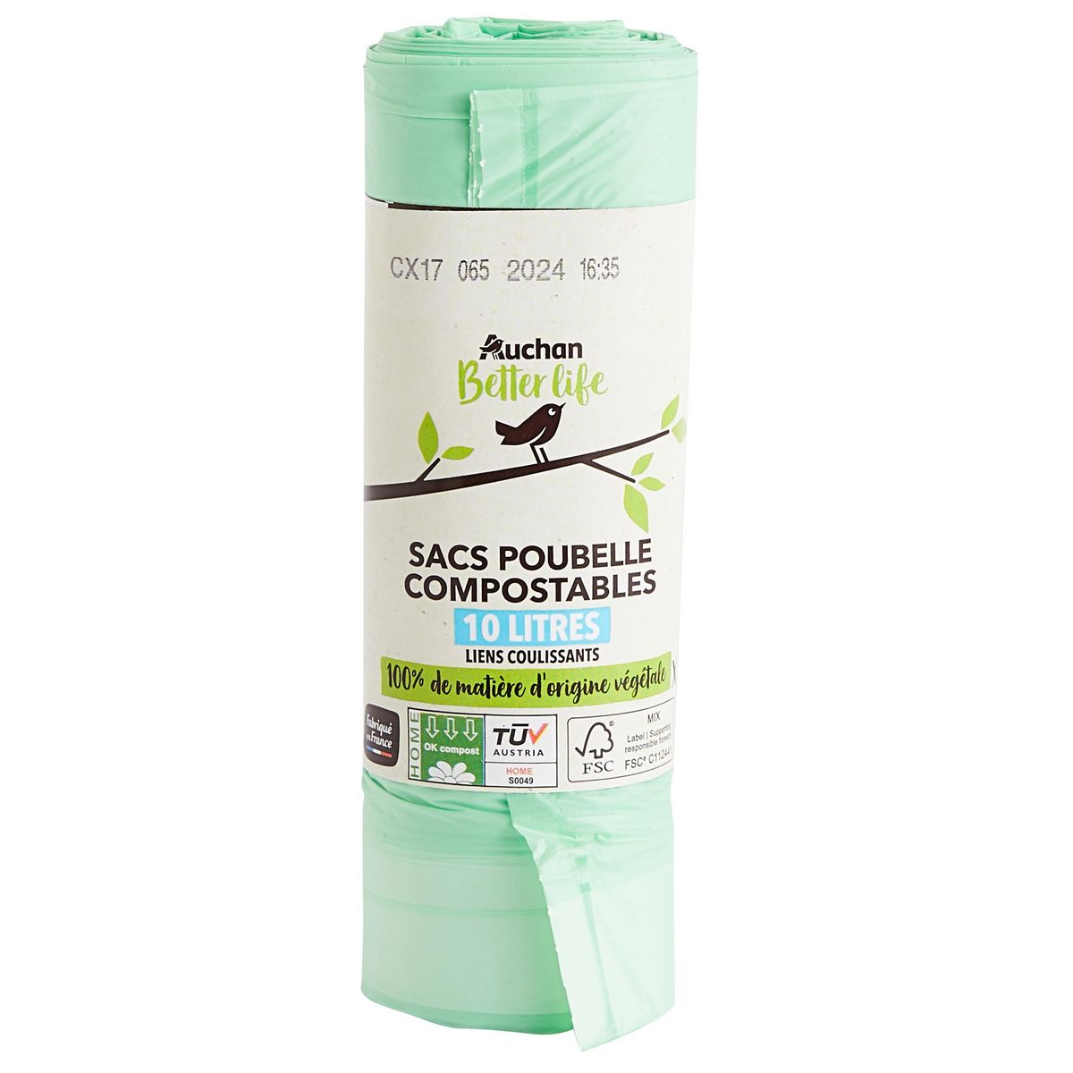 15 Sacs poubelle 10 litres à liens coulissants. Adaptés aux poubelles de cuisine. Composés de 100% de matière d'origine végétale, ils sont fabriqués en France et certifiés OK HOME COMPOST.