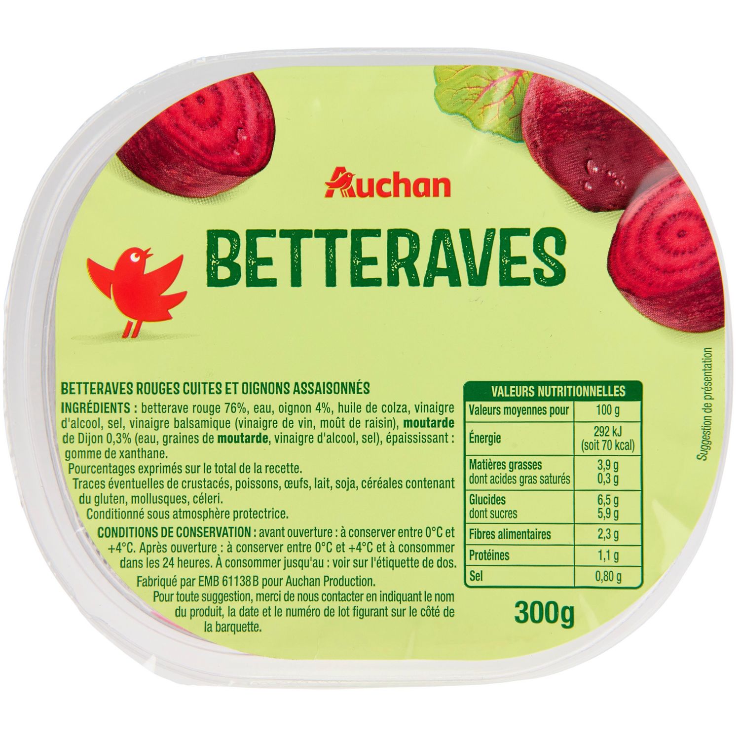 Ingrédients : Betterave rouge 76%, eau, oignon 4%, huile de colza, vinaigre d'alcool, sel, vinaigre balsamique (vinaigre de vin, moût de raisin), MOUTARDE de Dijon 0,3% (eau, graines de MOUTARDE, vinaigre d'alcool, sel), épaississant : gomme de xanthane. Pourcentages exprimés sur le total de la recette. Traces éventuelles de crustacés, poissons, œufs, lait, soja, céréales contenant du gluten, mollusques, céleri.