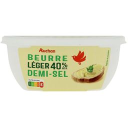 Un beurre léger à 40% de matières grasses, en déclinaison "demi-sel", en format "barquette" 250g, à tartiner sur du pain ou des biscottes
