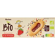 Ingrédients : Sucre de canne*, farine de blé 26,7%* (blé origine France), œufs 18,7%*, purée de fraise concentrée 9,4%*, purée de pomme 5%*, sirop de sucre de canne inverti*, jus de citron concentré*, huile végétale de tournesol*, gélifiant : pectines correcteurs d'acidité : citrates de sodium - citrates de calcium jus de sureau concentré*, sel marin, levure désactivée, arôme naturel de fraise.*Biologique.Traces éventuelles de fruits à coque, de lait, de moutarde, de soja et d'autres céréales contenant du gluten.