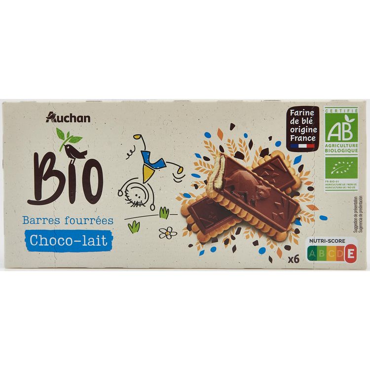 Biscuits avec tablette de chocolat au lait fourrée au lait (23,4%) issus de l’agriculture biologique