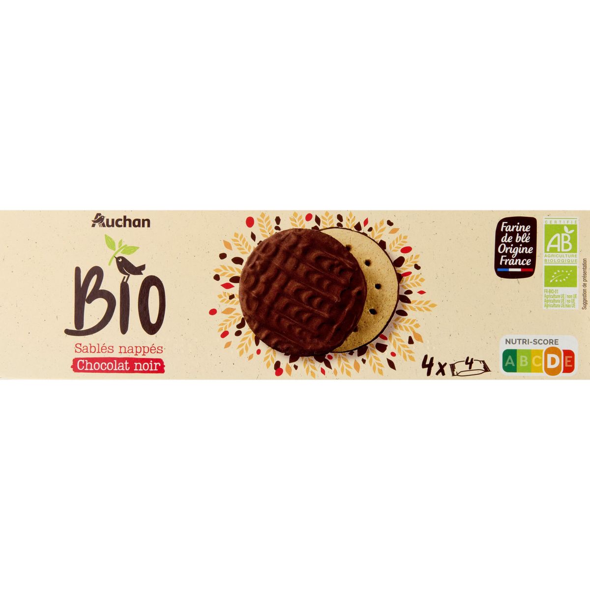 Ingrédients : Chocolat noir* 29% (pâte de cacao*, sucre de canne*, beurre de cacao*), farine de BLÉ* 25% (origine France), farine complète de BLÉ* 24% (origine France), huile de tournesol*, sucre de canne roux*, sirop d'ORGE malté déshydraté*, sel poudres à lever : carbonates d'ammonium, carbonates de sodium son de BLÉ* 0.2%, acidifiant : acide citrique. *Biologique. Traces éventuelles de lait, œufs, fruits à coque, de graines de sésame et d'autres céréales contenant du gluten.