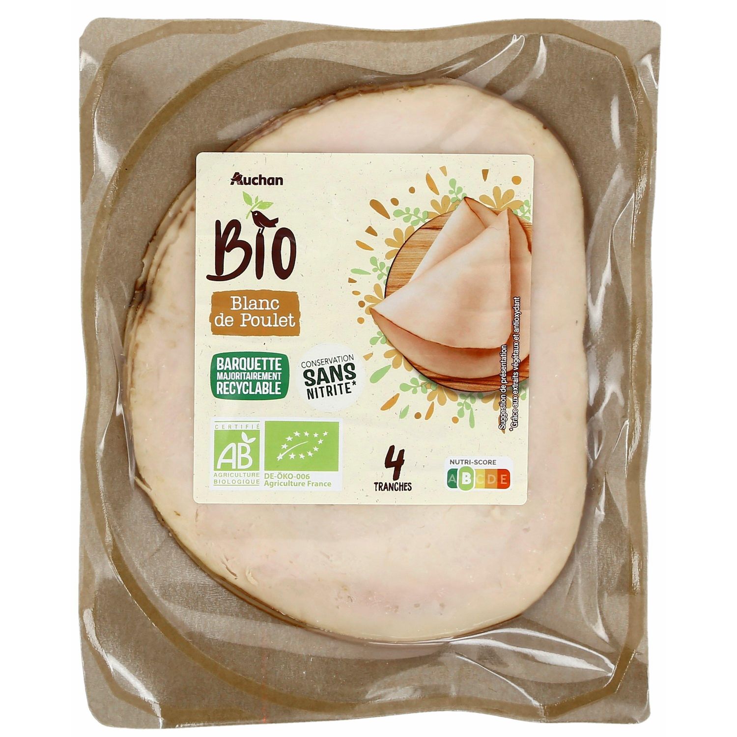 Un produit de qualité supérieure, issu de porcs élevés en agriculture BIOLOGIQUE, Fabriqué avec de la viande ORIGINE FRANCE de filets de Poulet à 100%. Conservation Sans Nitrites (grâce aux extraits végétaux et antioxydant). Emballage de la barquette majoritairement recyclable