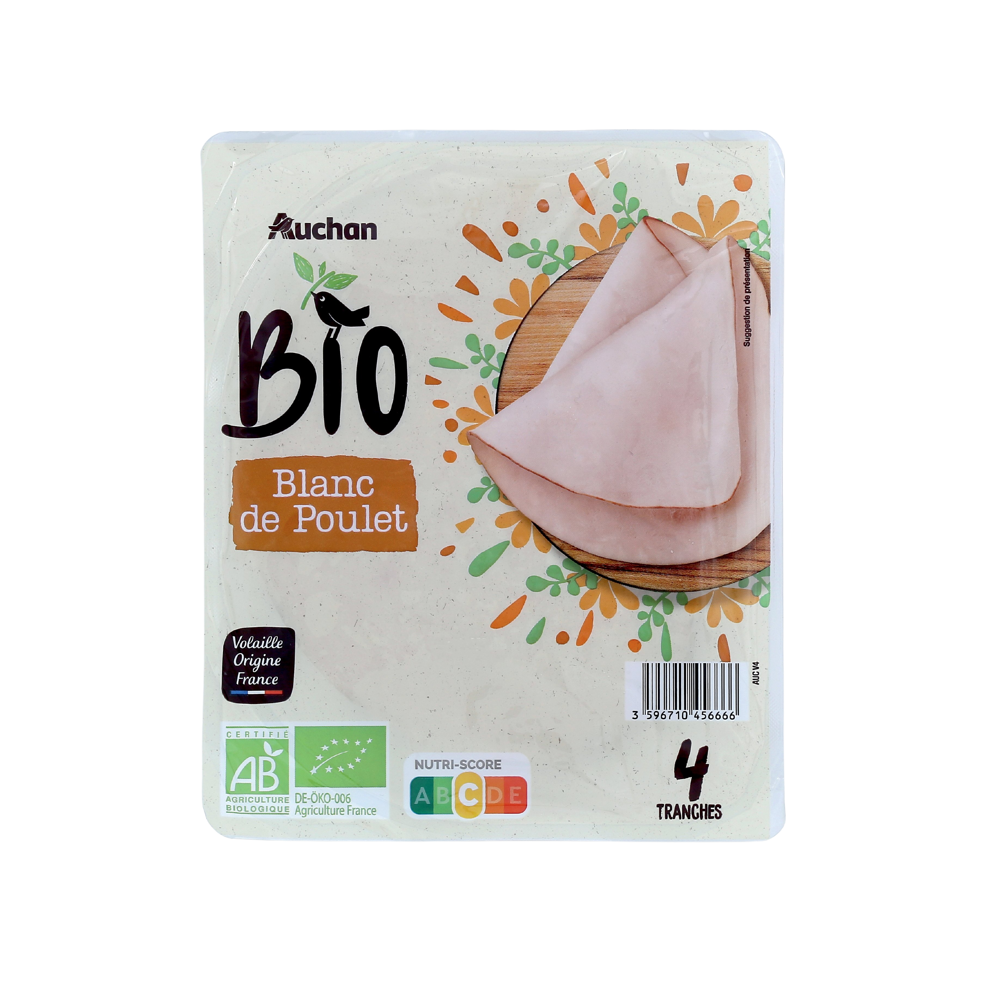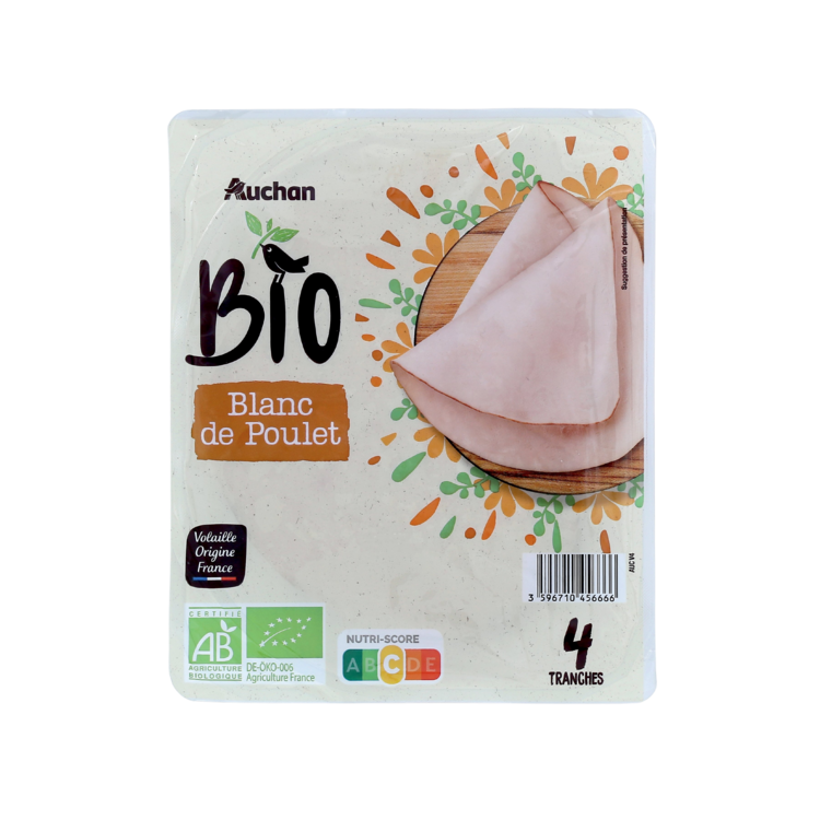 Ingrédients : Filet de Poulet* 90%, eau, sel, sucre de canne*, caramel* (sucre*, eau) antioxydant: ascorbate de sodium conservateur: nitrite de sodium. *biologique Elaboré à partir de poulet origine France Traces éventuelles de soja et de lait.