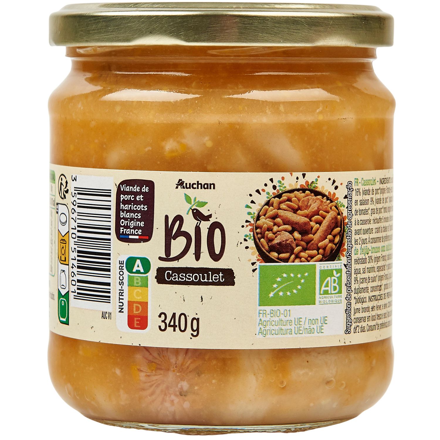 Ingrédients : Eau, Haricots blancs* réhydratés (origine France) 30% saucisses pur porc* 16% (viande de porc*(origine France), eau, sel marin, épices* et plantes aromatiques*) Viande de porc* traitée en salaison 9% (viande de porc* (origine France), eau, sel marin), farine de BLÉ*, sel marin, double concentré de tomates*, gras de porc* fondu (origine France), arômes naturels. *biologiques