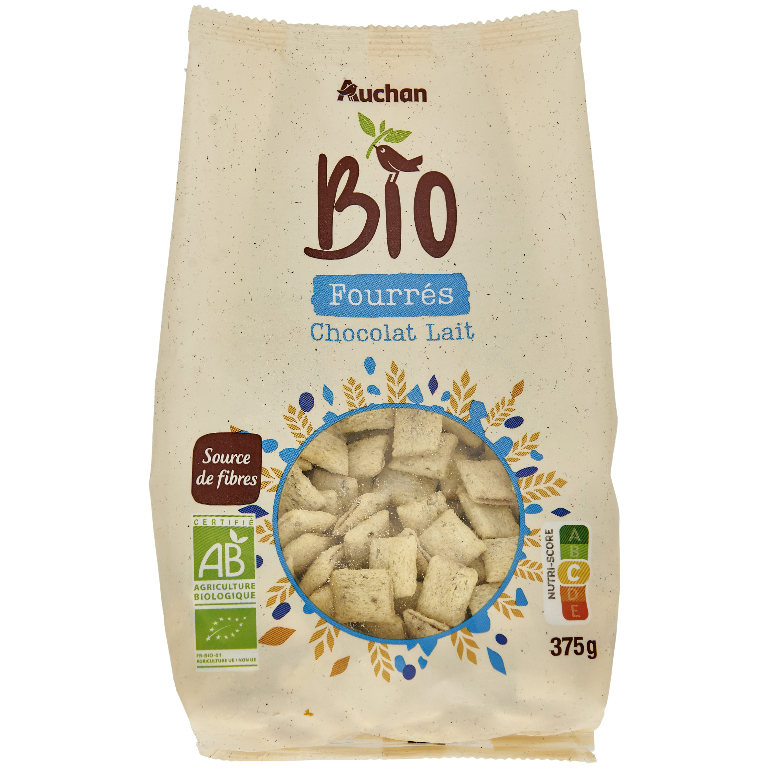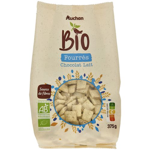Spécialité céréalière fourrée d'une préparation au chocolat au lait, issue de l'agriculture biologique