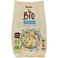 Ingrédients : Fourrage chocolat au LAIT* 35% [Huile végétale * (tournesol *), sucre de canne *, sirop de riz déshydraté *, LAIT écrémé en poudre *, LAIT entier en poudre * 7%, cacao en poudre allégé * 6,5%, chocolat en poudre * 6% (sucre de canne *, cacao poudre *), lactosérum (LAIT) en poudre *, beurre de cacao *, émulsifiant: lécithine de tournesol *.], semoule de maïs* 31,5%, farine de BLÉ* 25%, sucre*, sel*. *biologique Traces éventuelles de soja, de sésame, de fruits à coques.