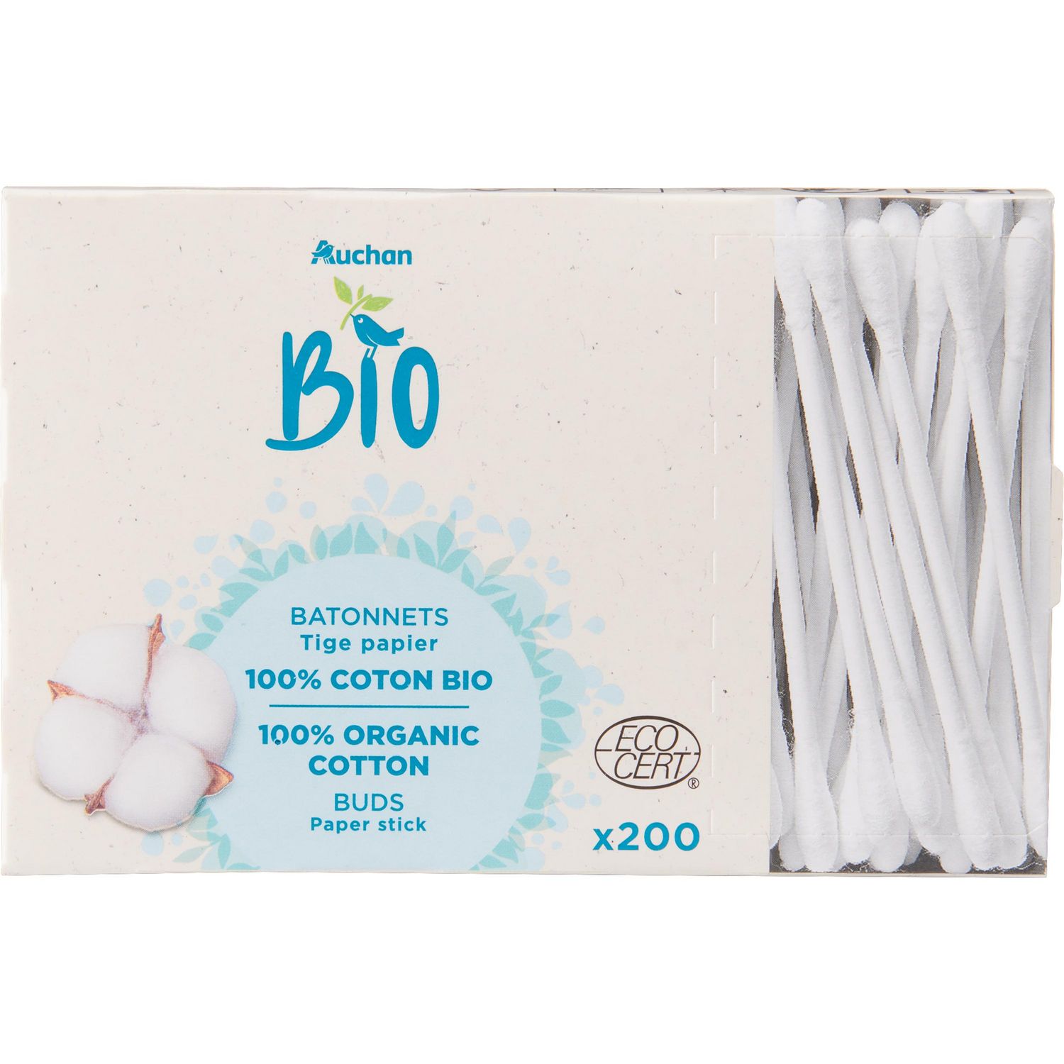 Composés d'embouts en coton 100% biologique et d'une tige en papier, les bâtonnets coton AUCHAN assurent un excellent confort à l'utilisation.'COSMOS ORGANIC certifié par ECOCERT Greenlife