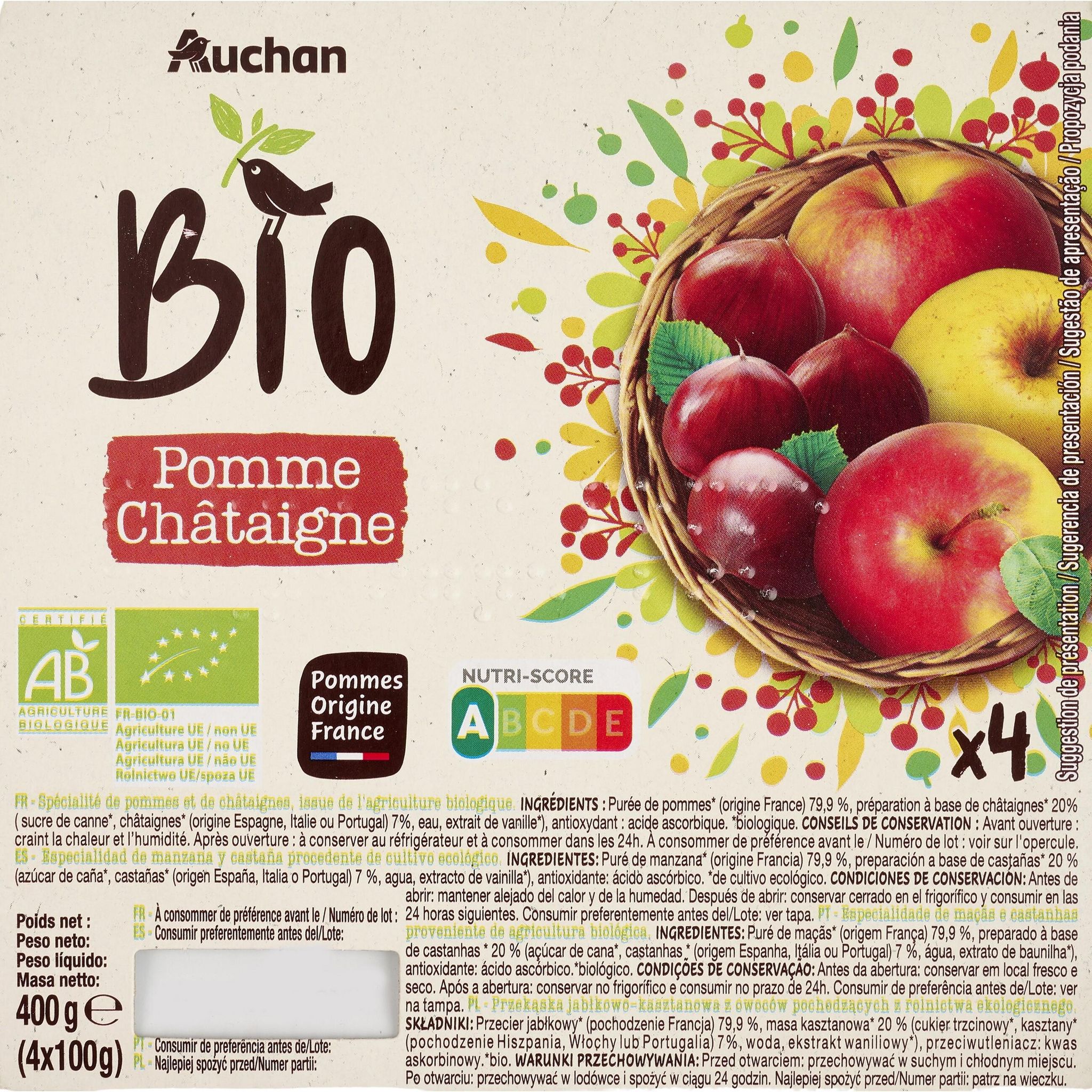 Ingrédients : Purée de pommes* (origine France) 79.9 %, préparation à base de châtaignes* 20% ( sucre de canne*, châtaignes* (origine Espagne, Italie ou Portugal) 7%, eau, extrait de vanille*), antioxydant : acide ascorbique. *Ingrédients issus de l'agriculture biologique