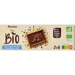 Biscuits petit beurre avec tablette de chocolat au lait BIO Auchan, fabriqués à Anneyron, dans la Drôme.