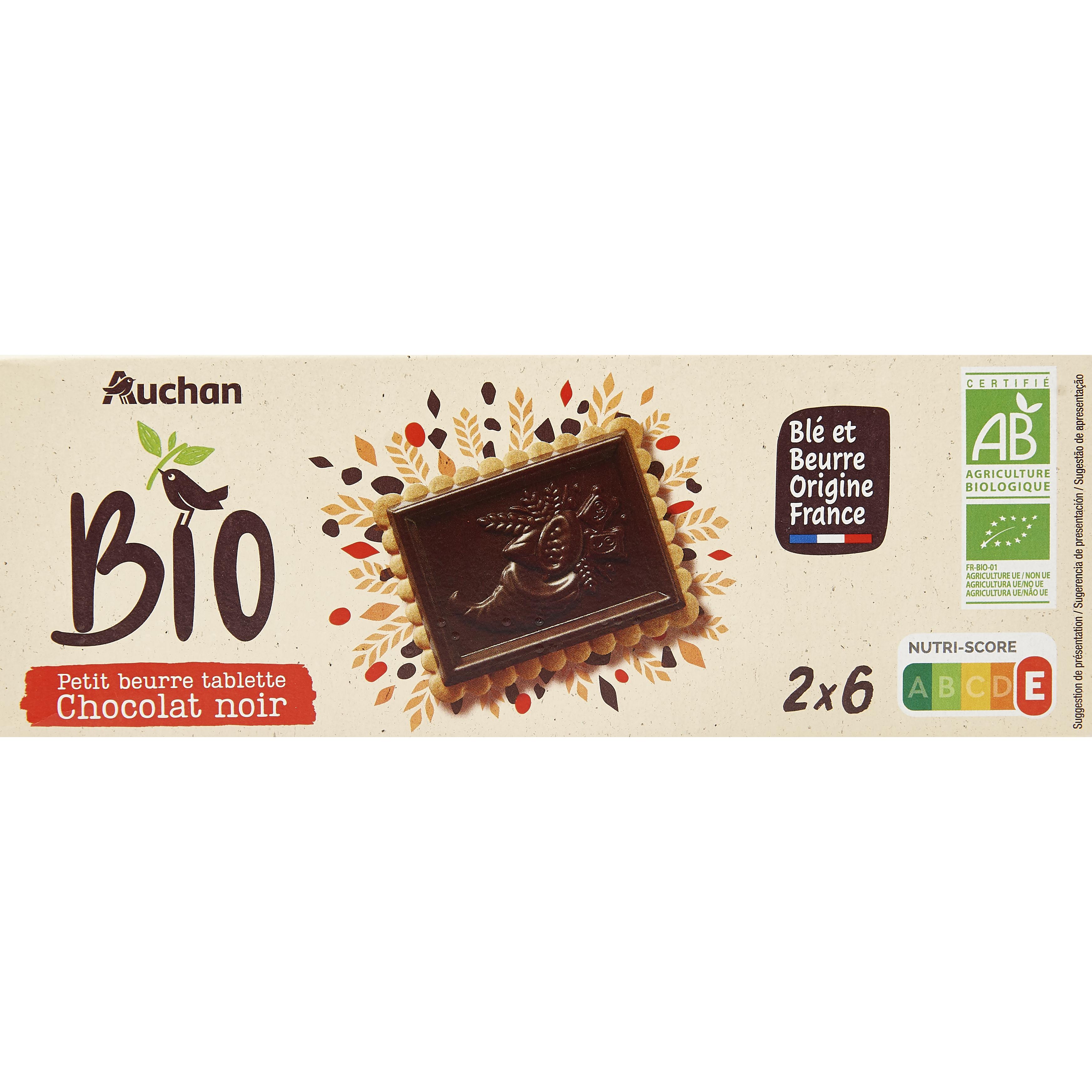 Biscuits petit beurre avec tablette de chocolat noir BIO Auchan, fabriqués à Anneyron, dans la Drôme.