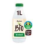 Un lait biologique, collecté et conditionné en France, écrémé, en bouteille en plastique 1L, Filière Responsable Auchan, "Solidaires" pour soutenir les producteurs avec une rémunération plus juste des éleveurs laitiers, provenant de vaches nourries sans ogm (< 0,9%) et au pré 250 jours en moyenne par an