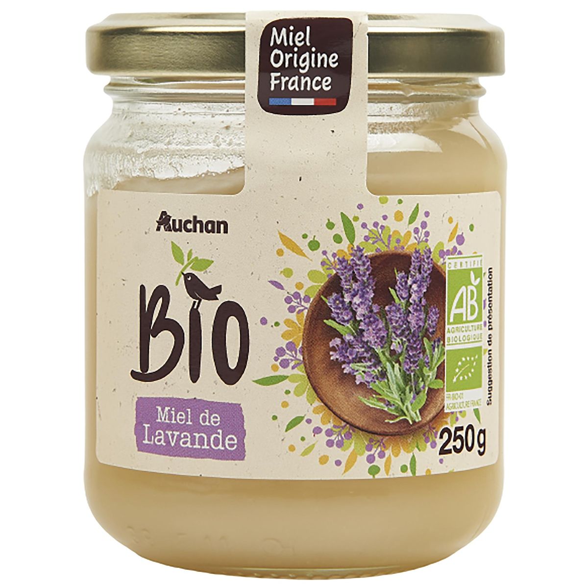 Miel Bio Auchan à la Lavande. Origine 100% France. Une filière responsable sur tous les plans : Environnemental : Les contrôles systématiques avant conditionnement assurent que le Miel BIO Auchan ne contient pas de résidus de pesticides ni d'antibiotiques. Il n'y a pas de traitement chimique s