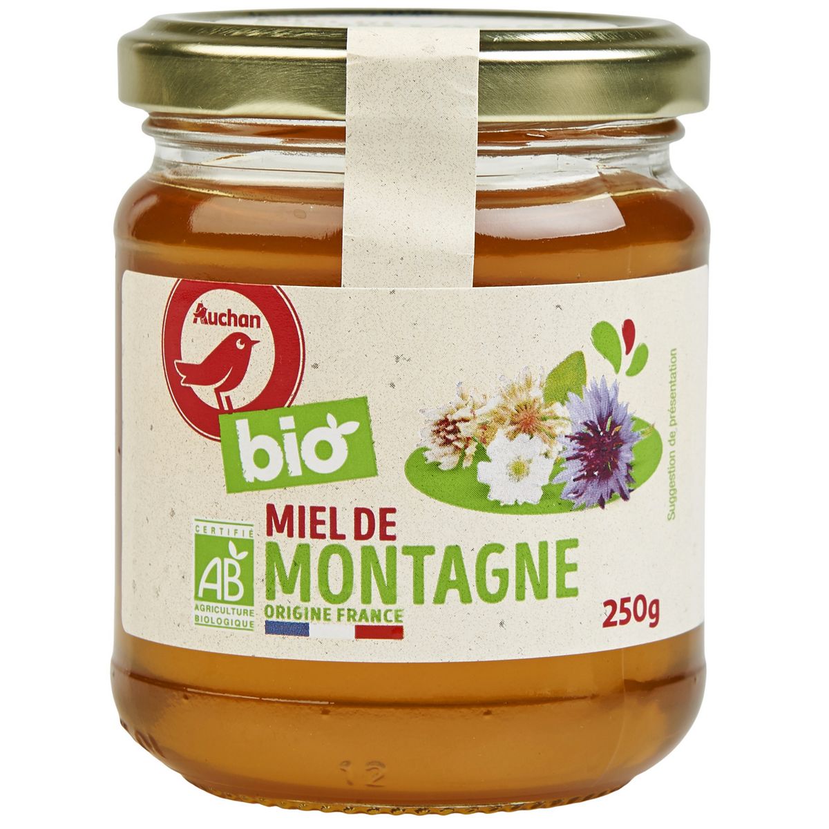 Miel de Montagne BIO Auchan. Origine 100% France. Une filière responsable sur tous les plans : Environnemental : Les contrôles systématiques avant conditionnement assurent que le Miel BIO Auchan ne contient pas de résidus de pesticides ni d'antibiotiques. Il n'y a pas de traitement chimique su