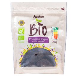 Pruneaux d'Agen avec noyau biologiques réhydratés à 35% d'humidité maximum et pasteurisés. Calibre: très gros (44/55 fruits aux 500g).