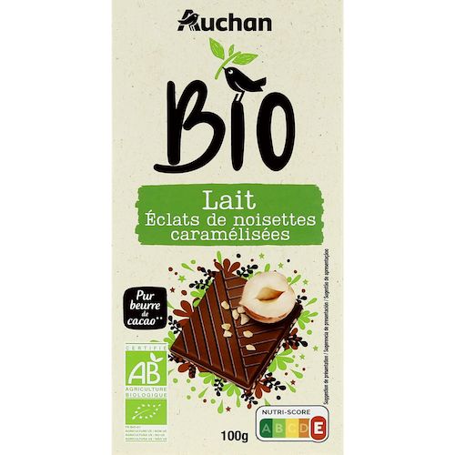 Tablette de chocolat au lait et éclats de noisettes caramélisées BIO Auchan, fabriquée en France.