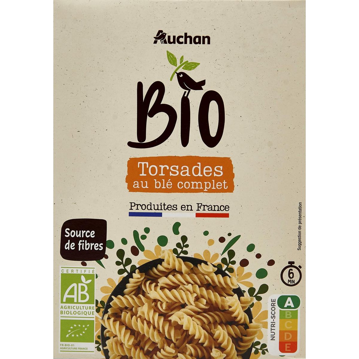 Nos pâtes bio Auchan sont élaborées à partir de blé dur BIO Français cultivé en Vendée. En choisissant ce blé Français Bio, Auchan contribue à développer une agriculture respectueuse de l'environnement grâce à la rotation des cultures et l'utilisation de solutions naturelles pour soigner des plantes, ce qui permet de conserver un sol fertile.