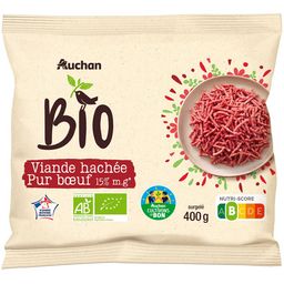 Viande hachée pur boeuf, issue de l'agriculture biologique, surgelée, certifiée par Ecocert FR-BIO-01
