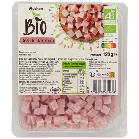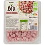 Dés de jambon cuit issus de l'agriculture biologique , de qualité supérieure. Produit multi-usages, indispensables pour vos quiches, cakes, pâtes, omelettes. salades, pizzas,… S’utilise chaud ou froid.