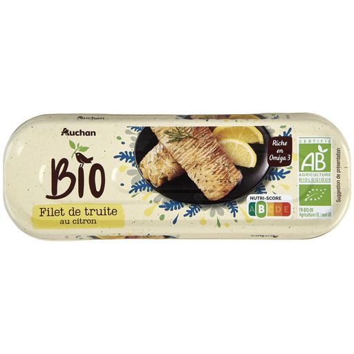 Filets de truite à l'huile d'olive vierge extra, citron et aneth biologiqueProduction certifiée par CERTIPAQ FR-BIO-09Distribution certifiée par ECOCERT FR-BIO-01