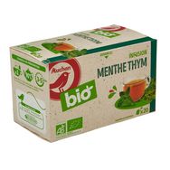 Ingrédients : Menthe(origine Egypte, Etats Unis, Géorgie et/ou Zimbabwe) 70%*, thym(origine Albanie, Allemagne, Kenya, Autriche, Egypte, Espagne, Zimbabweet/ou Turquie) 30%*.*biologique