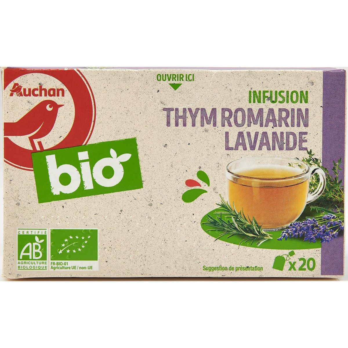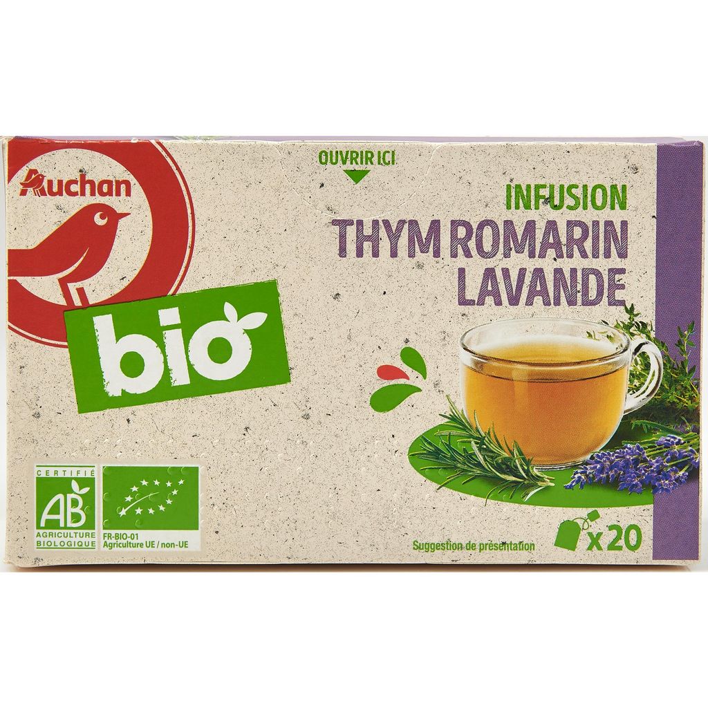 Ingrédients : Thym*(origine Albanie, Allemagne, Kenya, Autriche, Egypte, Espagne, Zimbabweet/ou Turquie) 50%, romarin* (origines Grèce et/ou Maroc) 40%, lavande*(origine Albanie, Bulgarie, France et/ou Espagne) 10%* *biologique