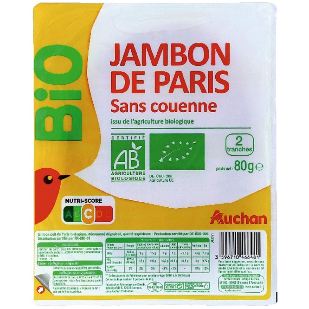 Jambon de porc*, eau, sel, dextrose* antioxydant: ascorbate de sodium arômes naturels conservateur: nitrite de sodium. * biologique Elaboré à partir de porc origine UE