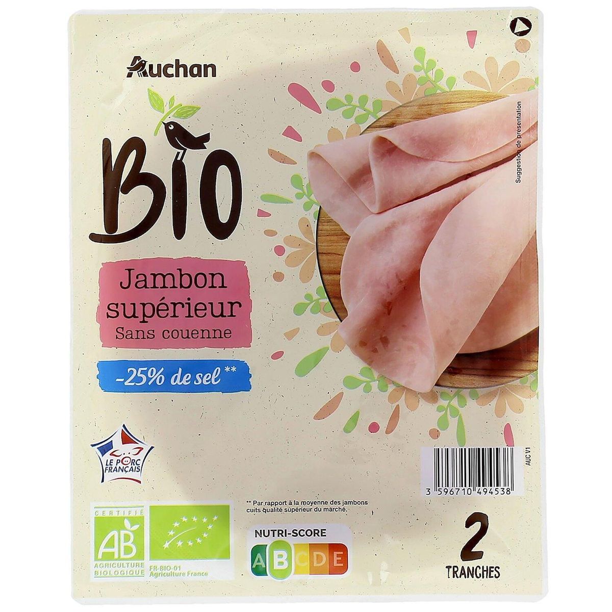 Jambon cuit supérieur découenné dégraissé issu de l'agriculture biologique à teneur en sel réduite de 25%**** Par rapport à la moyenne des jambons cuits qualité supérieur du marché.