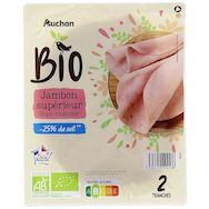 Jambon cuit de qualité supérieure, découenné et dégraissé, issu de Porc BIOLOGIQUE FRANCAIS. Jambon ayant un taux de sel réduit de 25% par rapport à la moyenne de sa gamme