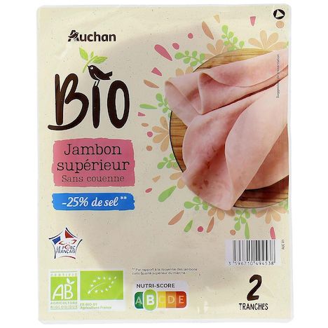 Ingrédients : Jambon de porc*, eau, sel, dextrose*, antioxydant : ascorbate de sodium, conservateur : nitrite de sodium.*biologiqueÉlaboré à partir de porc origine France