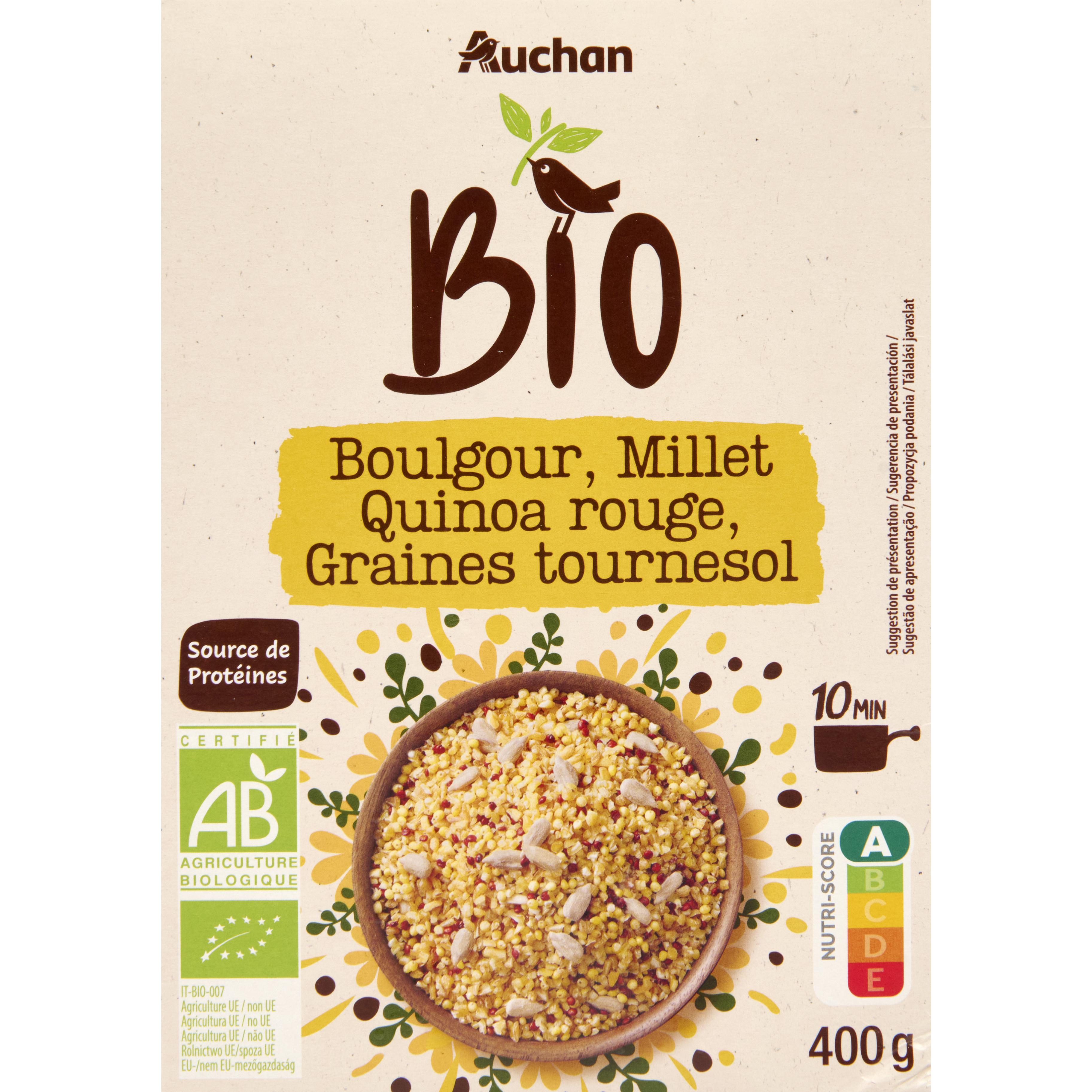 Mélange boulgour, millet, quinoa rouge, graines de tournesol issus de l'agriculture biologique. Production certifiée par IT-BIO-007. Distribution certifiée par FR-BIO-01