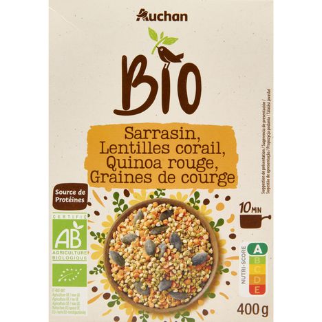 Blé sarrasin, lentilles corail, quinoa rouge, graines de courge issus de l’agriculture biologique Production certifiée par IT-BIO-007. Distribution certifiée par FR-BIO-01